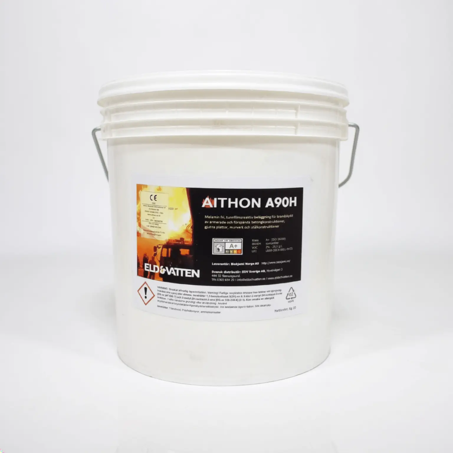 Aithon A90H är en brandskyddsfärg speciellt utformad för att skydda betongytor. Den ger en slät, matt vit finish som kan övermålas om olika kulörer eller finish önskas. Färgen är intumescent, vilket innebär att den sväller upp vid upphettning och bildar ett skyddande lager över ytan.
